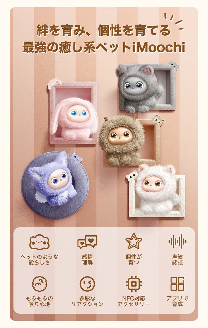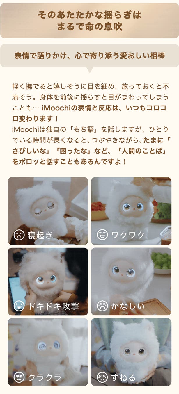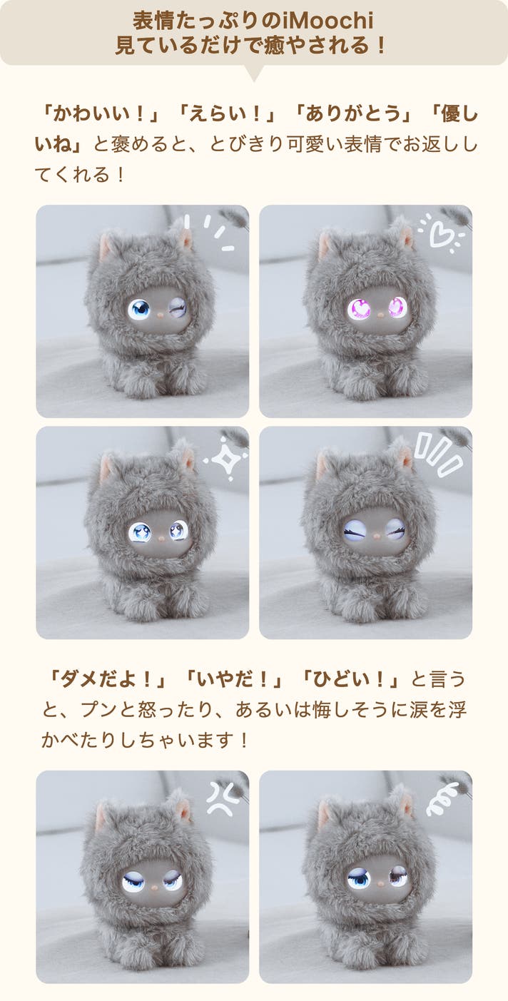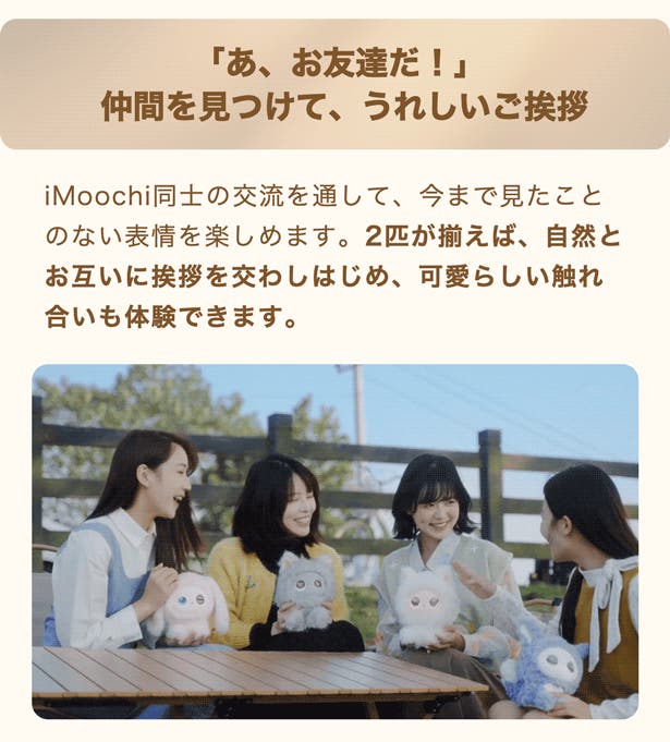 - 友達のiMoochiと交流することで、いつもと違う表情を見せてくれます。