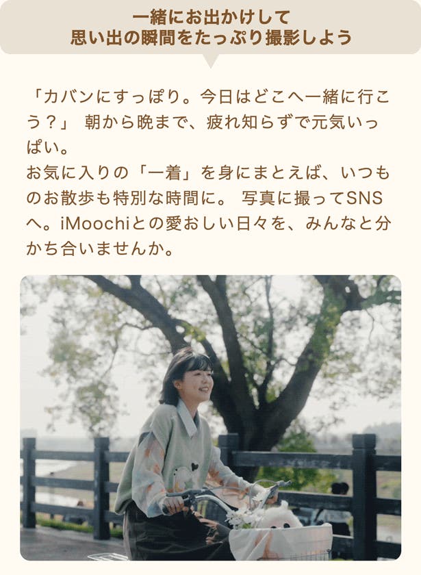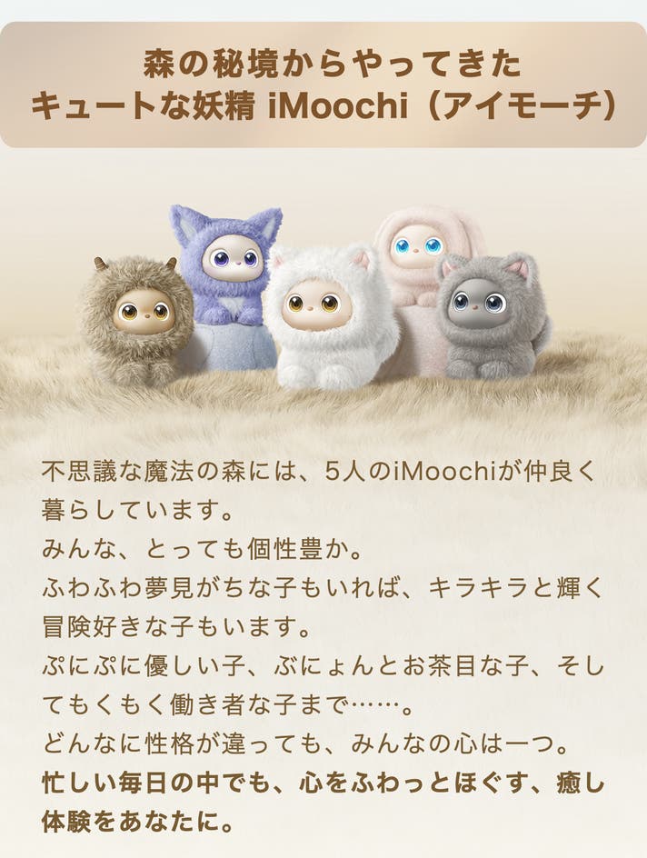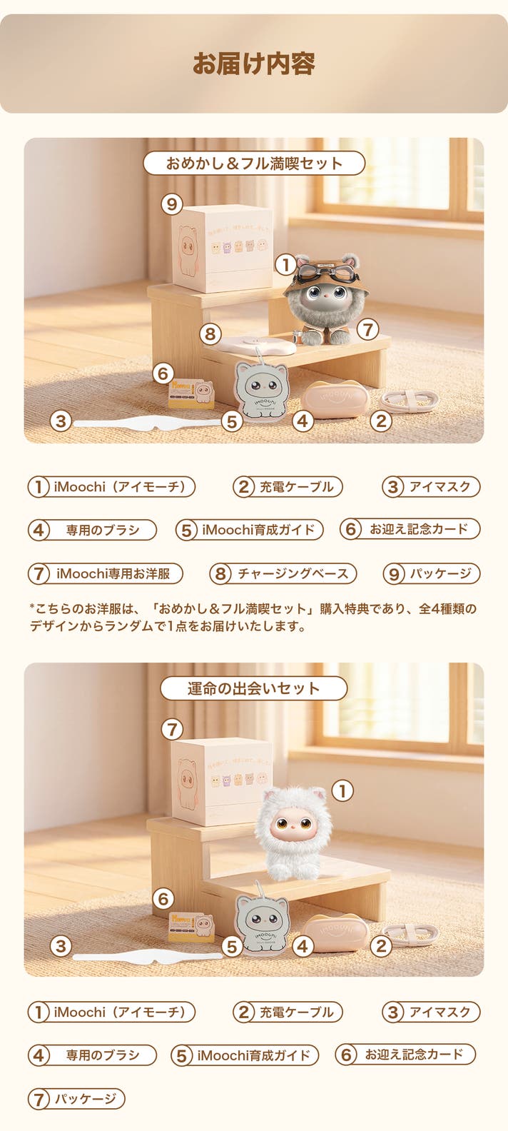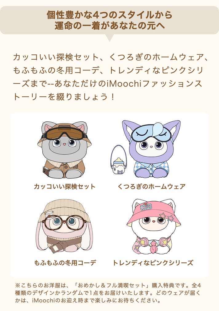 ※おめかし&フル満喫セット購入特典としてランダムで付いておりますiMoochi専用洋服は、本体とは別便でお送りいたします。ご了承ください。