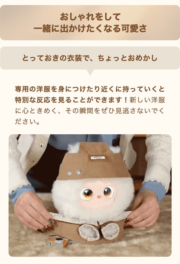 リアルなおめかし: 専用のお洋服を着せてあげてください。「わーい!」と喜ぶような、その服だけの特別なリアクションを見せてくれます。