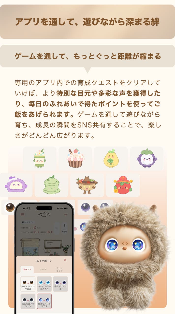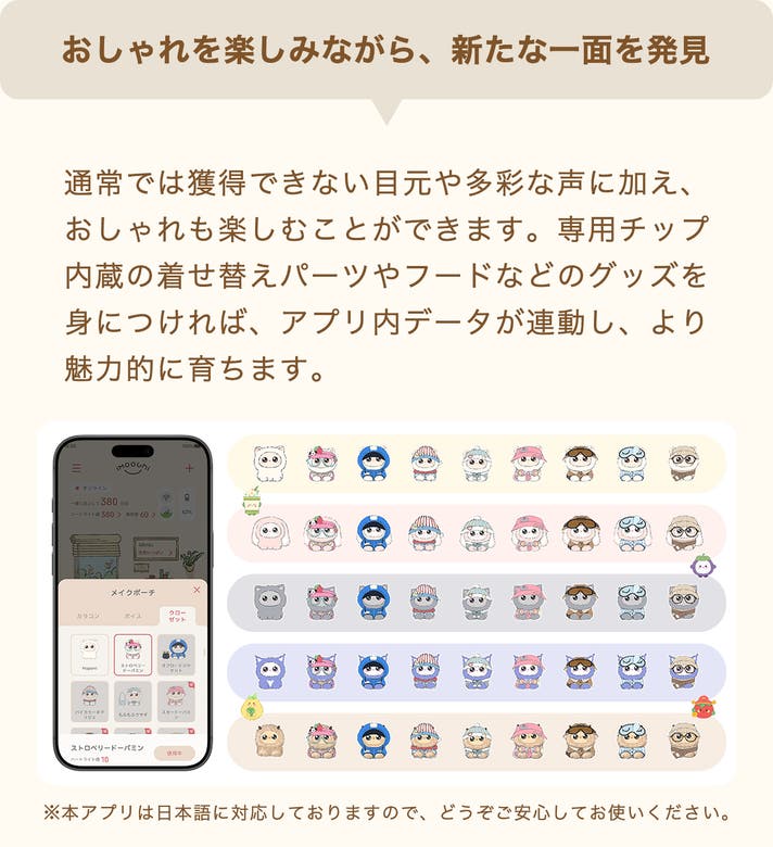 アプリでおしゃれ: 毎日一緒に遊ぶと貯まるポイントで、アプリ内のバーチャル衣装や瞳のエフェクトをゲット。あなた好みのスタイルを見つけてください。