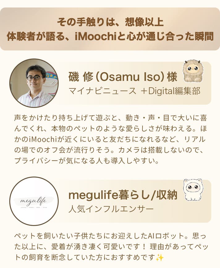 「Makuake(マクアケ)」は、実行者の想いを応援購入によって実現するアタラシイものやサービスのプラットフォームです。このページは、 プロダクトカテゴリの 「ひとりじゃない安心感を、その手のひらにiMoochi (アイモーチ)」プロジェクト詳細ページです。