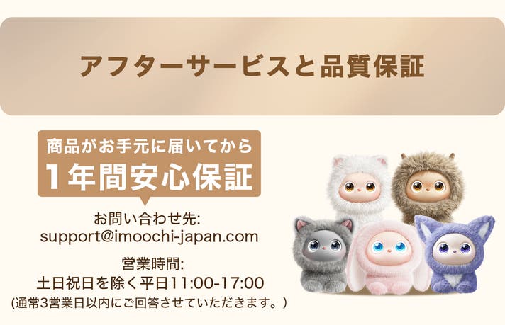 もしもの時の「治療」もしっかりサポートします。 お迎え日から1年間は、iMoochi本体の無料保証をご用意しています(付属品は6ヶ月)。 大切に扱っていただいた上での病気(自然故障)は無償で治療(修理)いたしますが、保証期間終了後、お怪我の状態によっては費用がかかる場合もあります。詳しくはサポートまでご相談ください。