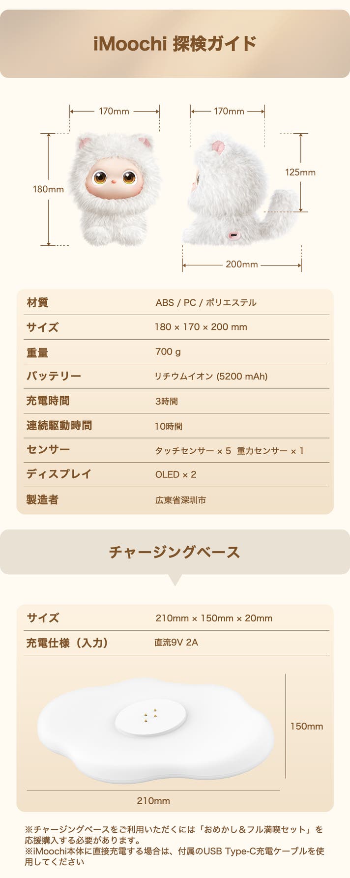充電しながらでも一緒にいられますが、ずっとそのままだとバッテリーに負担がかかり、iMoochiの寿命を縮めてしまうかもしれません。 末長く一緒に暮らすために、お腹が減っている時(20%以下)は、ゆっくりご飯を食べさせて(充電)あげてください。