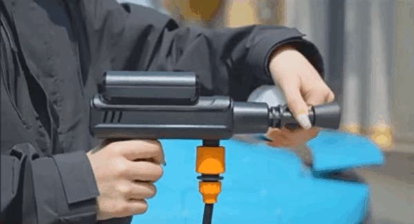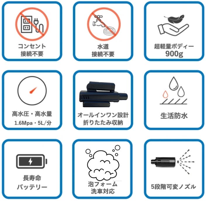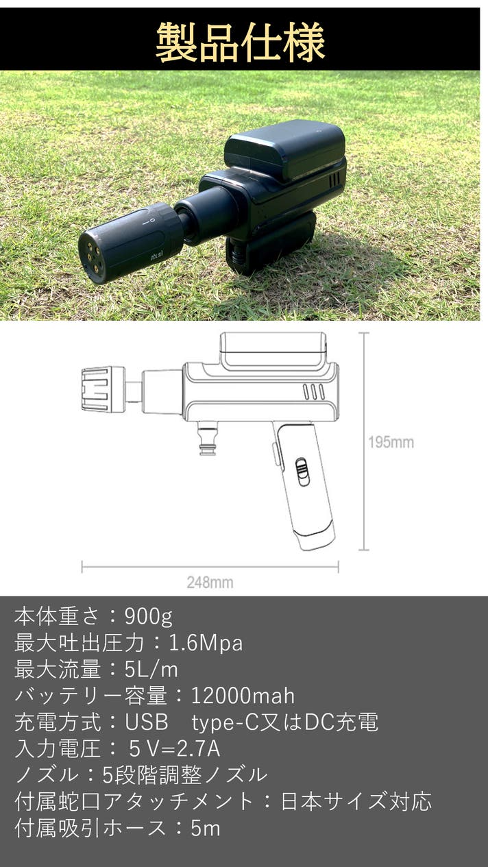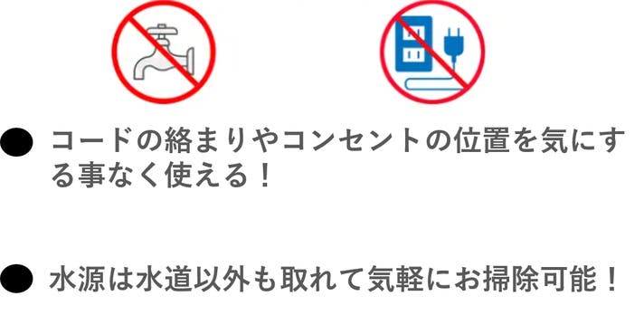 - 電源や蛇口への接続が不要なコードレス高圧洗浄機。バッテリーが一体化し、USB充電でお手軽掃除。