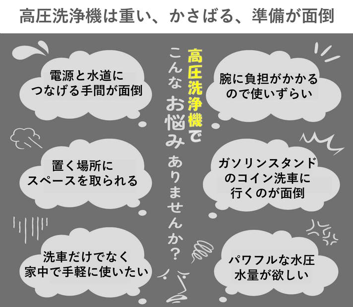 定期的に使うつもりが、次第に使うまでの準備が面倒に。数ヶ月もしないうちに物置の中に居座ったままに・・・そんな状況を脱却する手軽で掃除がやりたくなる高圧洗浄器で、コンパクトになっても性能は高水準な逸品です。
