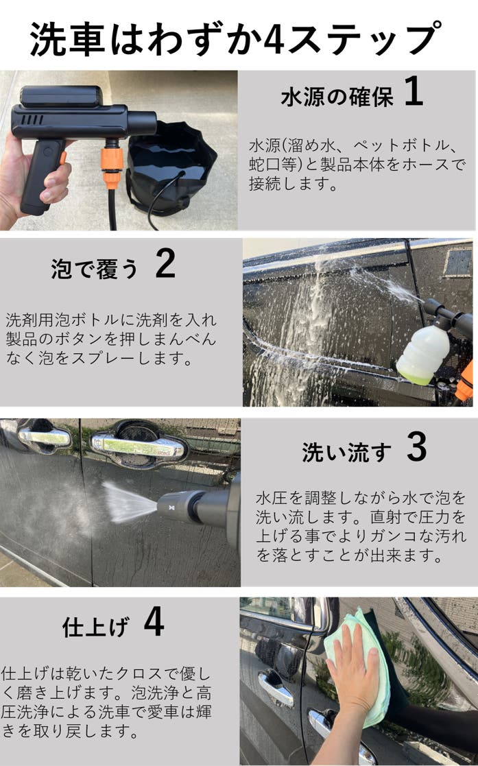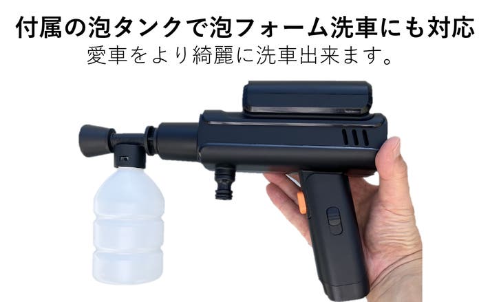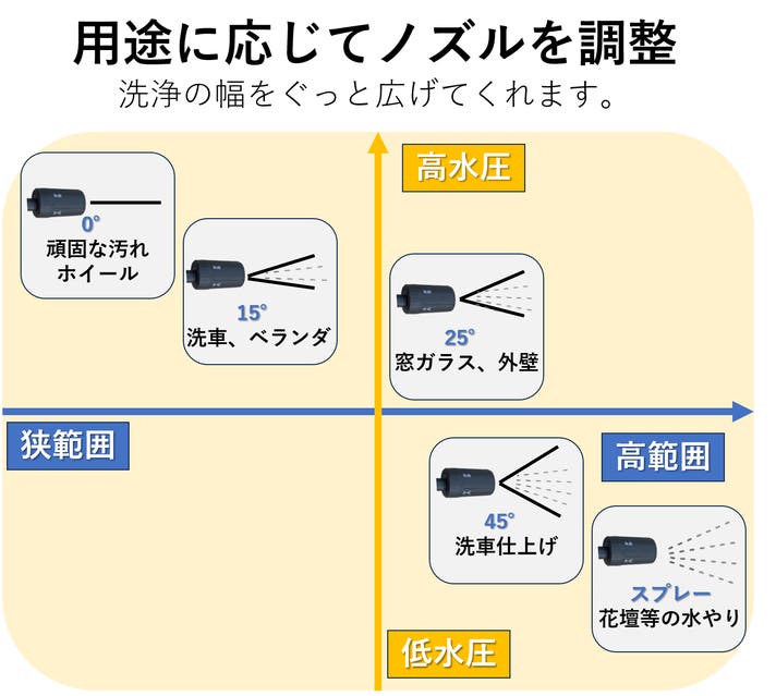 - 高水圧&大水量かつ0°〜45°の可変ノズル。泡フォーム洗車も可能で愛車を常にピカピカに。