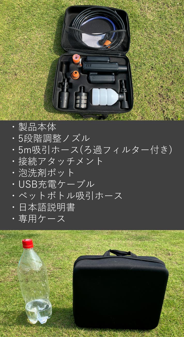 付属の専用ケースに付属品もまとめて収納して車に積んでおく事で、気になったときに場所を選ばずに洗車できます。
