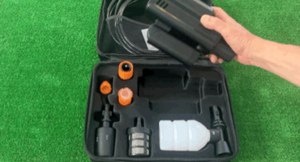今回紹介させて頂いた「impact wash Pro」はコンパクトながら12000mahの大容量バッテリーを備えた画期的な高圧洗浄器です。取っ手の部分を折りたたむことでよりコンパクトに収納出来、水源は有圧水、無圧水の両方に対応しています。