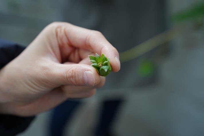いちご館窪田では、このように受粉がされていないいびつないちごは、身の小さい間に摘果(間引き)をします。そうすることによって、良いものだけを残し他のいちごに栄養が行き渡り、形も色も良い、美味しい苺が出来上がります。
