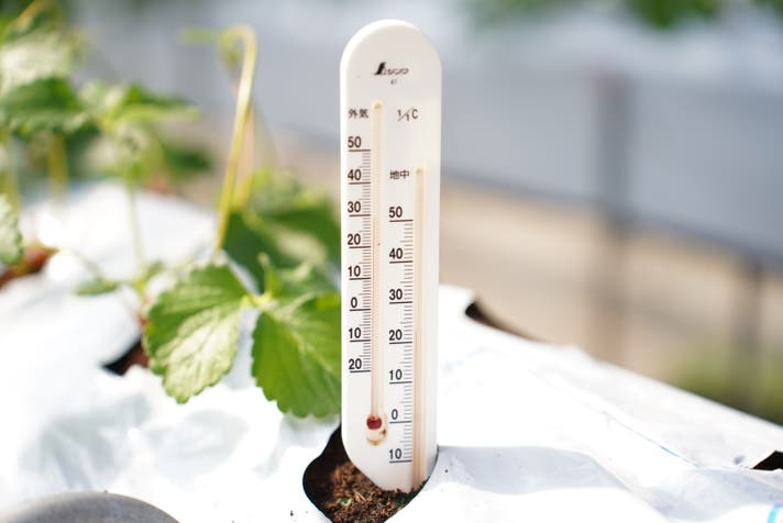 また、温度管理と言ってもハウスの中だけではありません。土の中の温度とハウス全体の温度、両方を管理します。土の中の温度は、温度が15度を下回らないように管理をし、ハウス内は、26度以上にならないように管理しています。