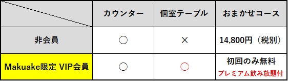 Makuakeではオープンを記念して、完全個室のテーブルが使えるVIP会員を募集をいたします。さらには、1回限りでおまかせコースがプレミアム飲み放題付でご利用いただけます。お得なこの機会をお見逃しなく!