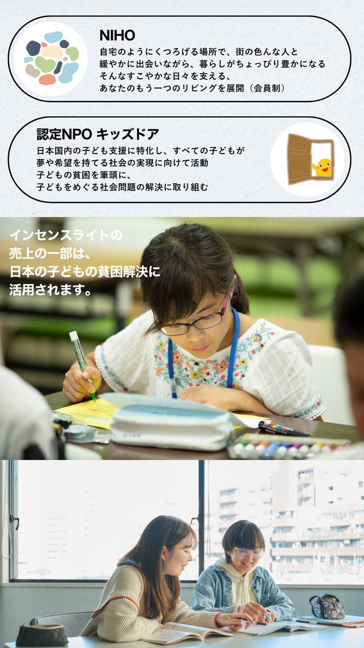 ※INCENSE LIGHTの売上の1%は、日本の子供の貧困課題の解決に取り組む 認定NPO法人キッズドア様へ寄付されます。また、日本の自然環境を守る活動の一助となるよう本プロダクトの配送用のパッケージには、収益の一部が公益財団法人 日本自然保護協会様へ寄付される制度を利用したパッケージを採用しております。