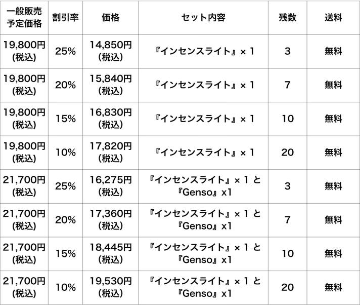 販売予定価格:インセンスライト 19,800円(税込)と1,900円(税込)より15%OFFの特別価格 (送料無料)