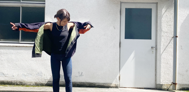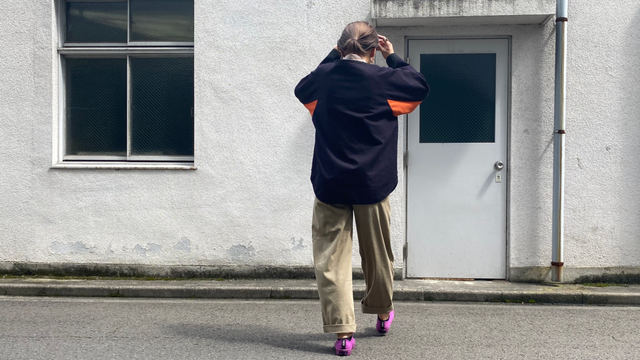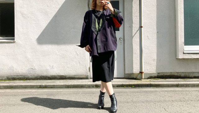 ホディはややAラインシルエットで、身幅に対して袖が長すぎないように調整しております。