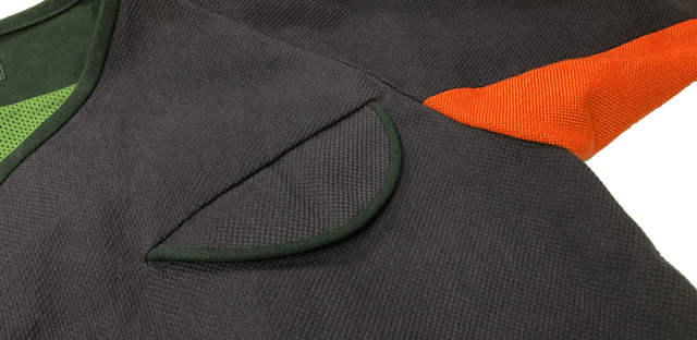 そして着用していて生地の摩擦が一番多いそで裏部分を切り替え、違う質感の生地同士の摩擦にすることで消耗を軽減させる狙いがあります。