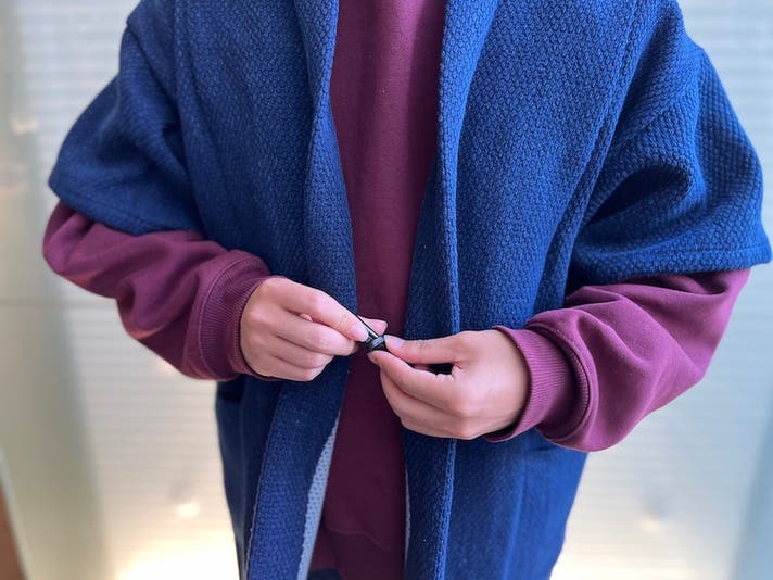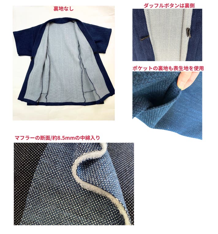 デザインで工夫した点は、半纏を街着としても生活感ができにくいように、ポケットを脇に寄せている点です。