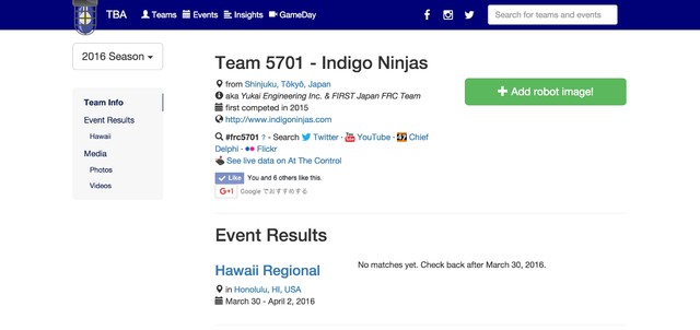 (thebluealliance.comという、全FRCチームの大会情報が掲載されるウェブサイト。確かに、Team 5701はハワイ大会に出場します!)