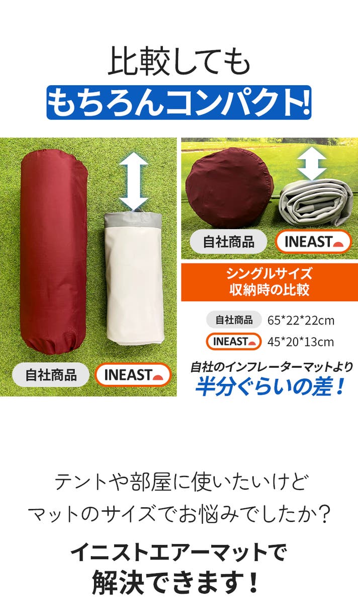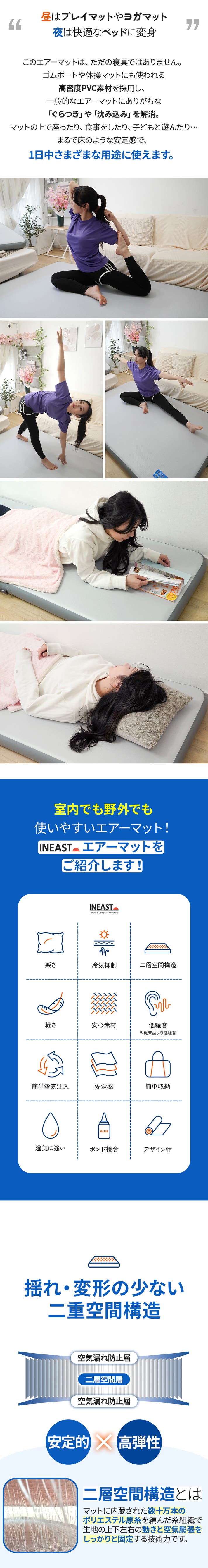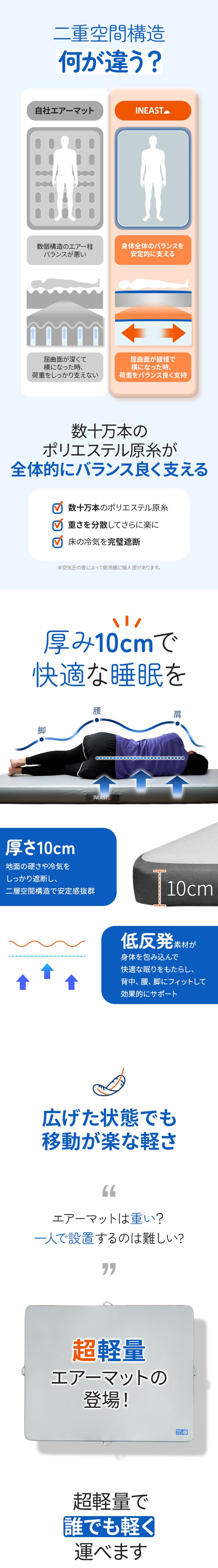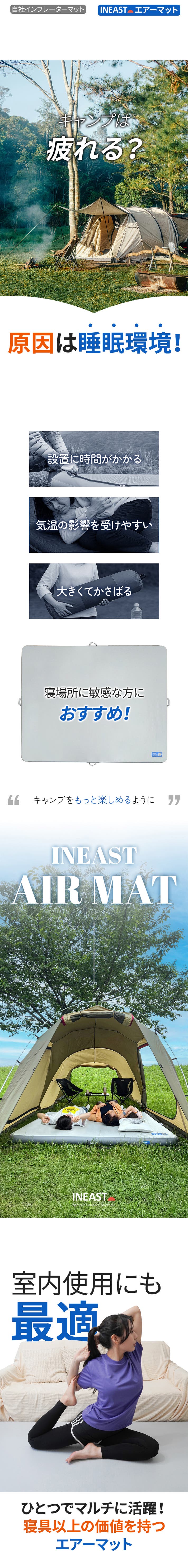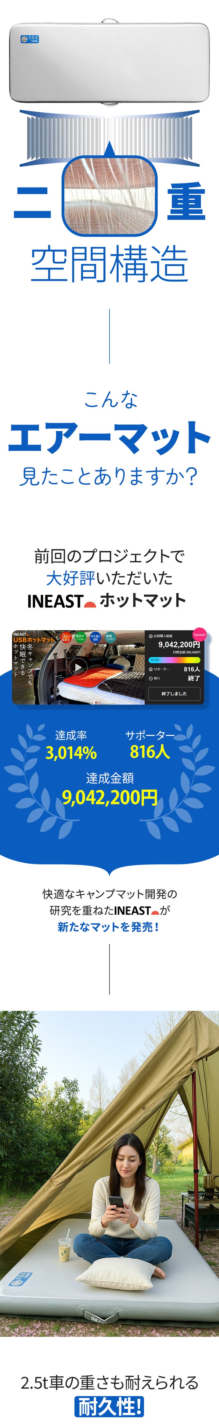 INEASTブランドのマットです。以前INEASTではホットマットを製造販売をし、マクアケで成功。その後も秋~春先にたくさんのご購入をいただきました。今回はエアーマットをプロジェクト実施させていただくことになりました。ぜひご検討のほどよろしくお願いいたします。