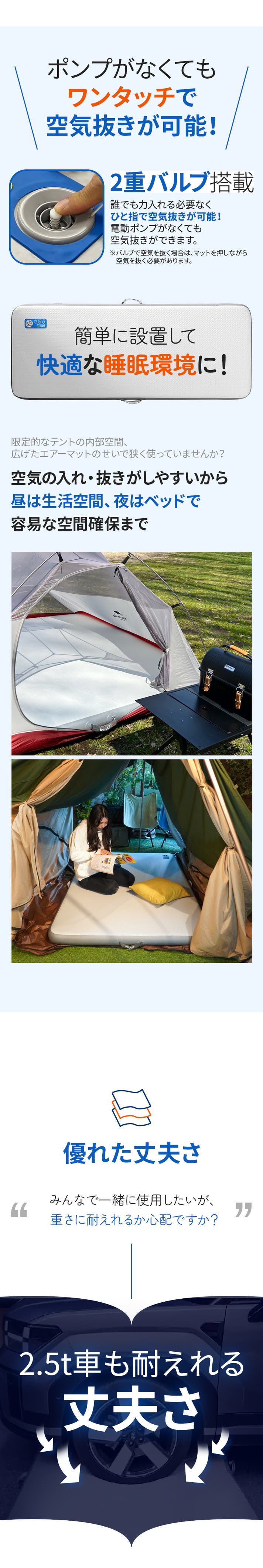 A:自動ポンプは空気入れ、空気抜きが可能です。手動ポンプは空気入れのみとなりますので、空気を抜くときはエアーマットの栓部分を押し、空気を抜いていき、エアーマットを畳んで空気を抜く必要があります。