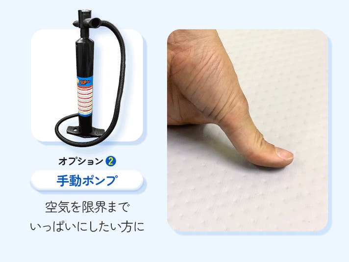 -手動ポンプは空気入れ専用で、空気抜きができません。空気を抜くときは、エアーマットの栓部分を押し、エアーマットを畳んで空気を抜いてください。