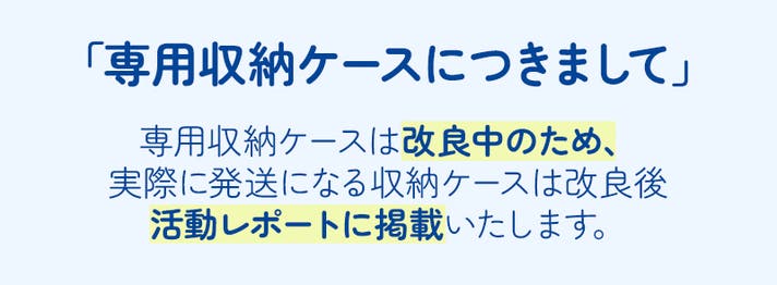 -専用収納ケースは改良中です。商品ページにはサンプルの収納ケースを使用しております。デザインが確定しましたら、活動レポートにてご案内いたします。