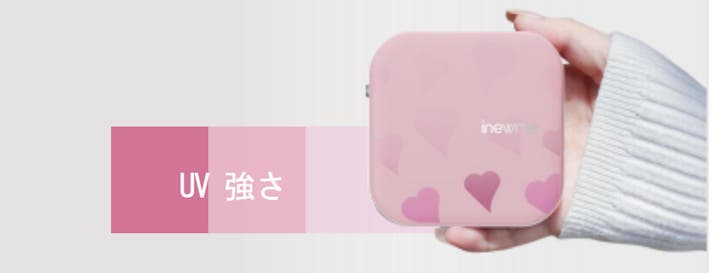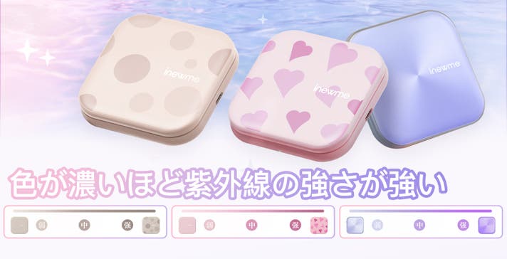 inewmeスマートミラーの外装は、紫外線の強さに反応して変化する特殊な素材で作られています。強い日差しの下では、ケースの色が濃くなったり、隠れていたハート柄および水玉柄がふわっと浮かび上がったりします。