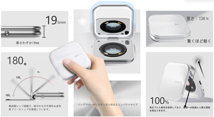 毎日使うものだからこそ、使い心地にも妥協しません。inewmeスマートミラーは、わずか135gの軽量ボディで、バッグやポーチにもすっきり収まるコンパクトサイズ。