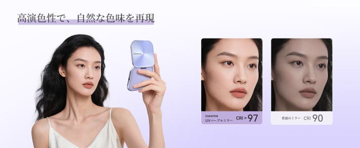 さらに、演色性はCRI97以上という高い基準をクリアしており、まるで自然光の下で見るかのように正確な肌色を再現します。室内でも屋外でも、時間帯や場所を問わず、肌の見え方を最も自然な状態で確認できます。
