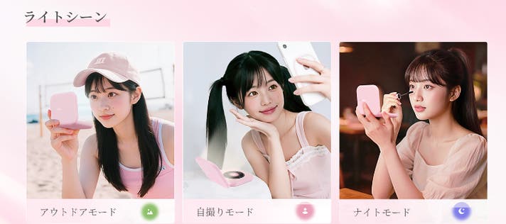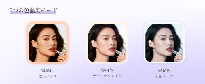 ※Liteモデルは色温・明るさを個別に調整する機能はなく、代わりに「屋外モード」「セルフィーモード」「ナイトモード」の3つのシーン別ライティングが搭載されています。使用シーンに応じてワンタッチで最適な光に切り替えることができます。