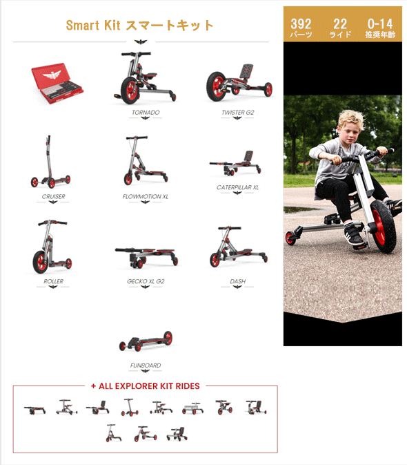 スマートキットを使用すると、エクスプローラー/パイオニアキットを使用して乗り物を作成可能に。また、3つの大きな乗り物の1つを選ぶこともできます。 子供時代のためのプレミアム品質の楽しみを提供。ツイスト、ターン、スクートして0〜14歳までのお子様が楽しめます。将来のための貴重なスキルを開発するのに役立ちます。