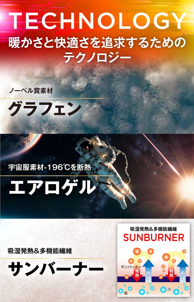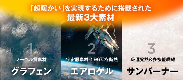 断熱性、保温性、快適性を追求して出会った3素材をふんだんに採用し、超薄くて超暖かいを実現しました。
