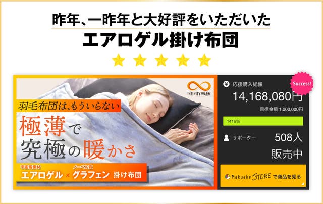 過去のプロジェクトでは目標金額の1416%達成し、多くの応援購入者様に製品をお届けすることができました!今年の製品はさらに改良。もっと暖かく!もっと冬の睡眠を快適にをテーマにスタッフ一同製品を企画して参りました!