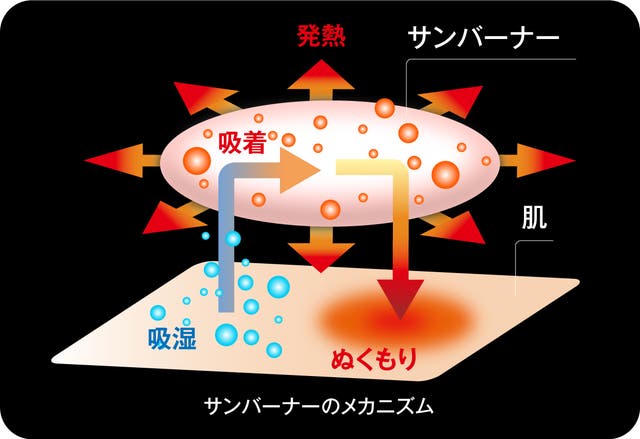 サンバーナーは、まわりの水蒸気を吸収するとき、「吸着熱」と呼ばれる熱が発生。「サンバーナー」は多くの親水基により高い吸湿能力を持ち「吸着熱」を発生させます。このメカニズムにより、身体から発した水分など余分な湿気を吸い取り熱に変換します。