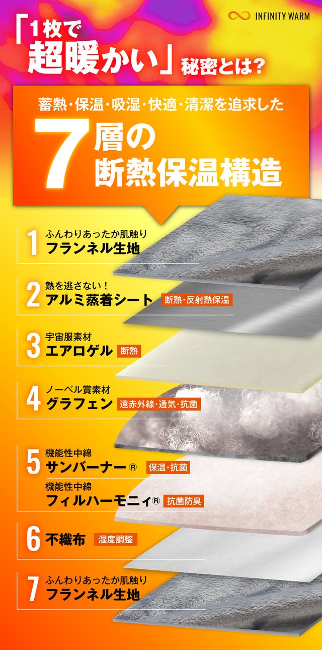 宇宙服素材の「エアロゲル」にプラスして、熱を逃さない「アルミ蒸着シート」、高い強度と優れた熱伝導性、保温力が特徴のノーベル賞素材「グラフェン」、さらに中綿には機能性中綿「サンバーナー」「フィルハーモニィ」を2種類使用した、こだわりの7層の構造となっております。※フィルハーモニィは東洋紡エムシー株式会社の登録商標です
