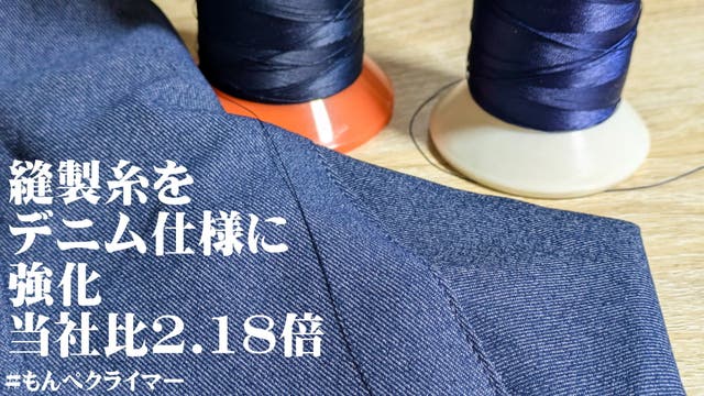 縫い糸にデニムに使われる同番手より強度、伸び率ともに高い「モノフィラメント糸30番」を使用し、縫製を物理的に強化しました