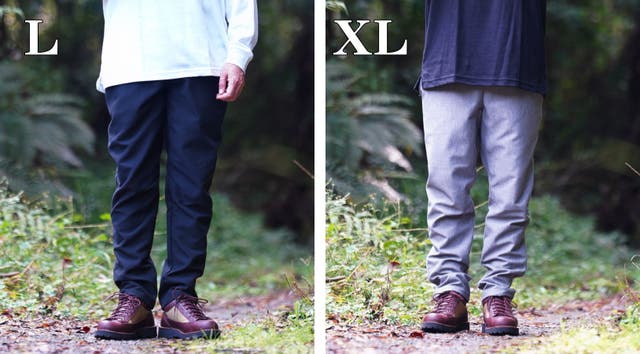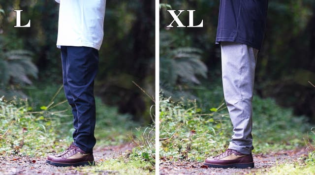 XLはウエストに縦にした拳1つ分余裕があり、Lはジャストシルエット