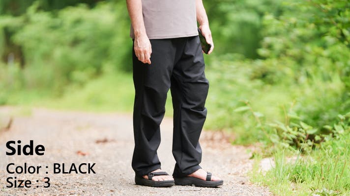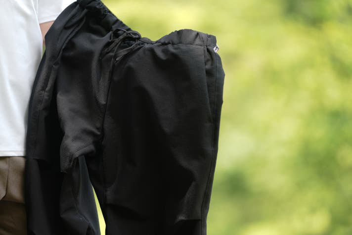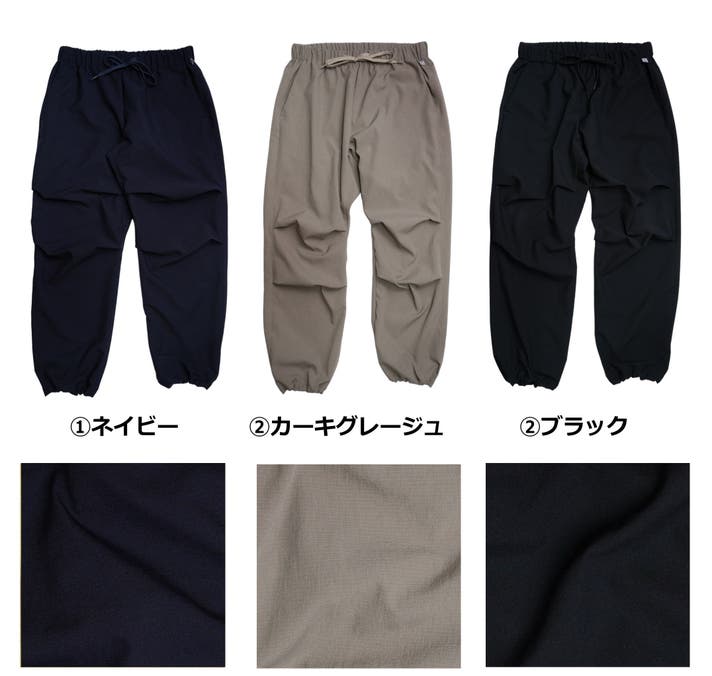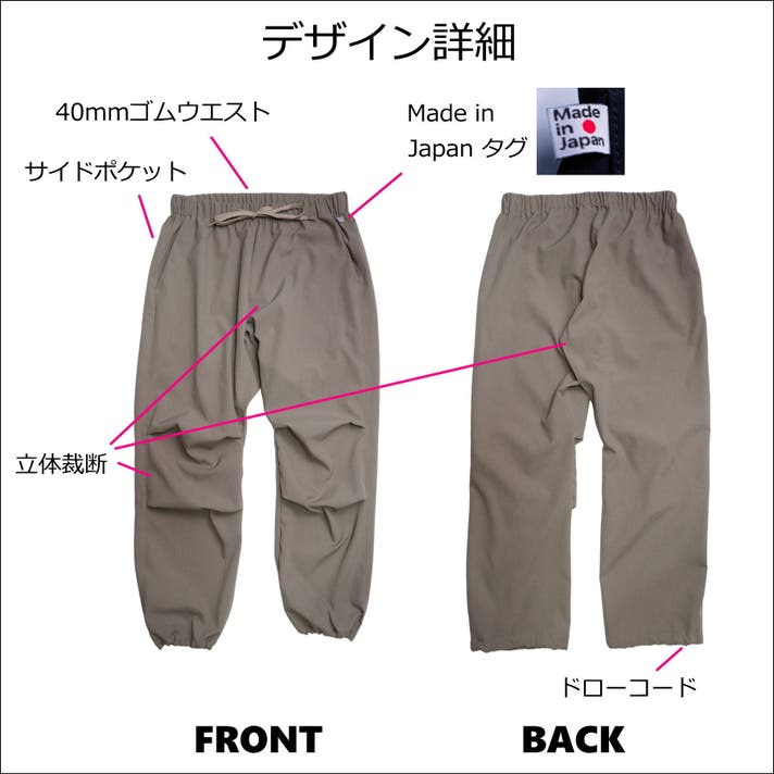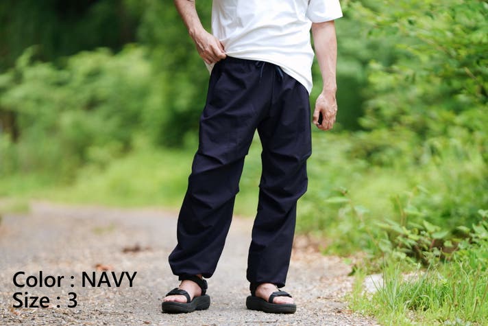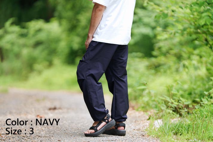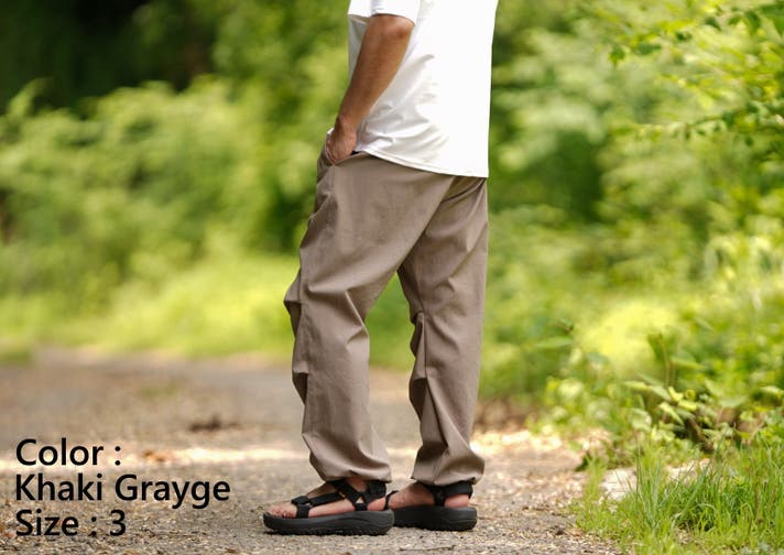 今回は、去年使用した素材に変わる「夏に涼しく履けるロングパンツ用の素材」を探し出し、パンツの形が考え付いたので商品化にこぎつけました