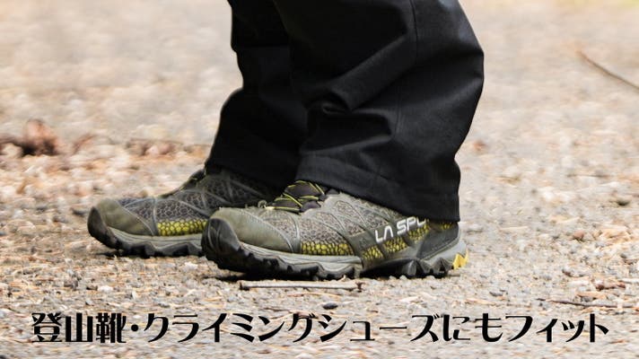 立体裁断のおかげで、登山やクライミングの足上げや開脚、しゃがんだり座ったりする際も突っ張らずに快適