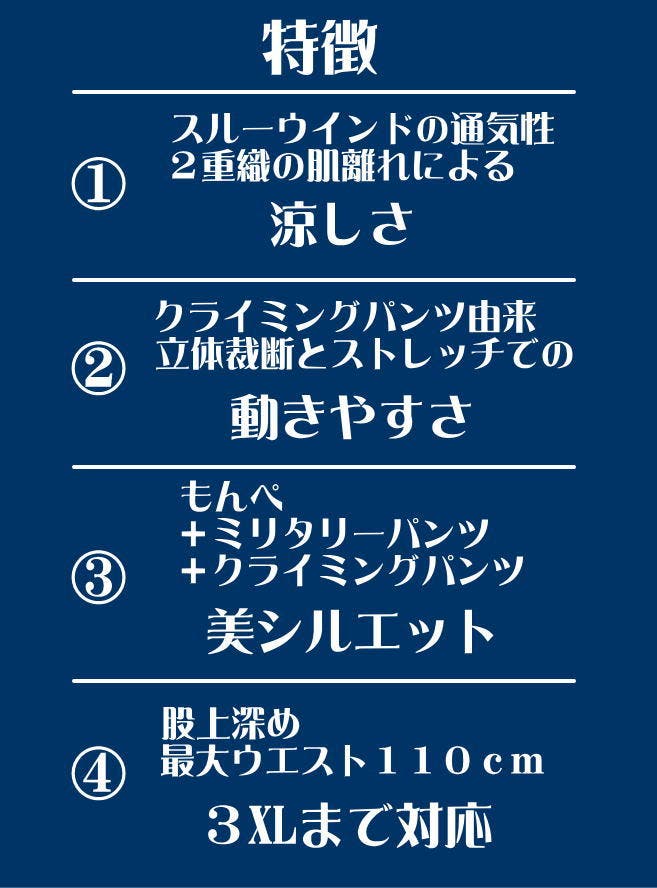- イラストの「もんぺ」の形を再現◆クライミングパンツと融合「もんぺクライマー」