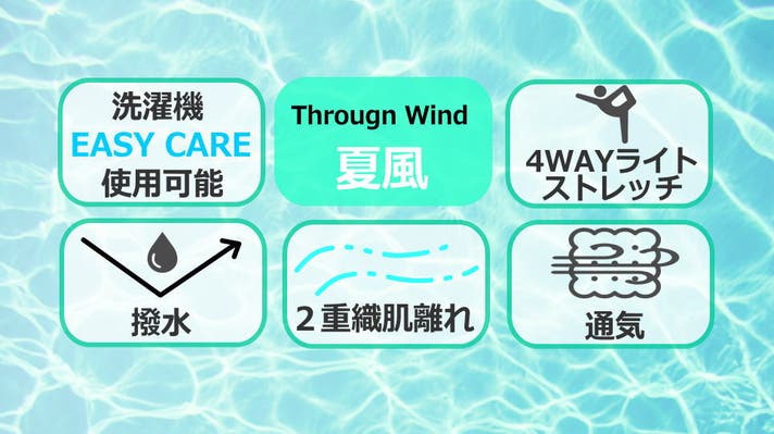 ”スルーウインド”は、特殊原糸と織物構造をベースに、国内大手メーカーが独自の加工技術を駆使することで通気孔を発現させた、通気性の高い、快適機能素材です。