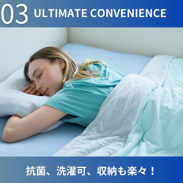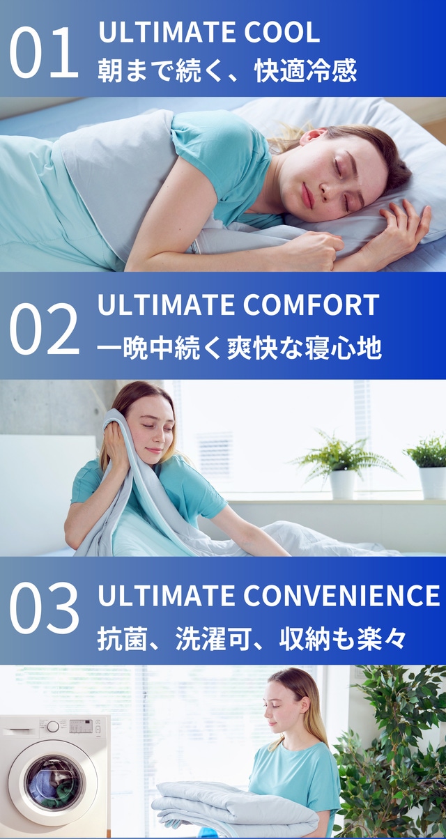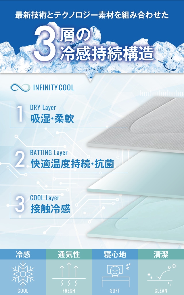 「朝まで続く快適冷感」、「爽快な寝心地」、「お手入れの簡単さ」の3大要素がそろった冷感掛け布団「INFINITY COOL」で、理想な睡眠体験を〜