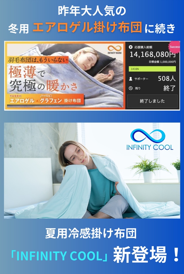 この夏、さらなる快適な睡眠体験を届けるべく、最先端テクノロジーを採用した冷感掛け布団「INFINITY COOL」プロジェクト始動!これまでのエアシリーズと同様に、最先端な素材を採用し、高機能と心地よさを兼ね備えた1枚となっております。サポーターの皆様に、これまで以上に素晴らしい睡眠体験をお届けできることを願っております。