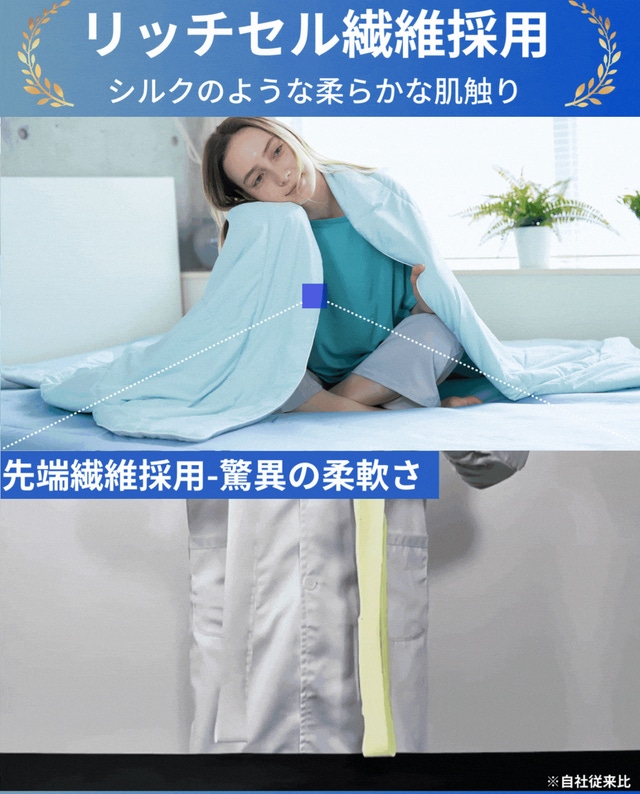 さらに先端なRichcel®(リッチセル)繊維採用したことで、清涼感あふれるひんやりタッチ、シルクを超える柔らかさ、高級感のある贅沢な布団に仕上げました。