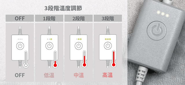 ヒーティングマットは、長時間連続で使うと熱く感じる場合があります。3段階調節が可能なので、長時間使用の場合、低温に設定することで低温火傷を防ぎます。