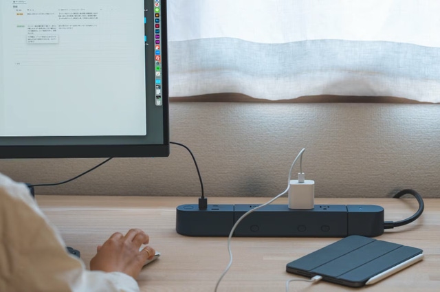 細かなUSBケーブルの使用が頻繁なデスク周りではついついコンセントの数も増えてしまいますが、見た目は美しく、使い勝手は十分にご使用いただけます。
