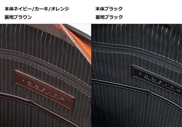 本体カラー ネイビー、カーキ、オレンジにはブラウンの裏地、