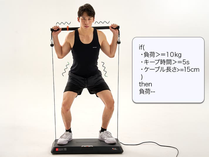 バーベルには、負荷のオン/オフを切り替えるコントローラーが付いているため、ワンクリックで素早くトレーニングを開始します。トレーニング中に危険を感じた際には、いつでも負荷をオフにすることができます。