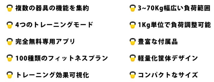 過去の「筋トレをすれば、ジムに行く」という常識を覆し、最も使用されている複数の筋トレの器具の機能を一台に集約し、4つの負荷モードに加え、無料アプリより100以上のフィットネスプランを提供することにより、ジムを通わず自宅で女性やお年寄りを含めた初心者でも気軽に筋トレを行えます。