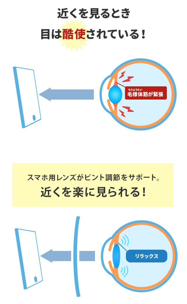 スマホで「ブルーライト」から目を守ることと同様に、「ピント調節」も大切です。近くのものを見るときに目の筋肉は硬直し緊張しますが、スマホをじっと見ていて、ふと遠くを見ると景色がぼやけたようになる症状は「スマホ老眼」といわれ、長時間近くを見すぎることから起こります。イノベーターブルーライトカットメガネのスマホ用レンズは、近くにピントをあわせやすくするため、+0.5度数が入っています。スマホやタブレットなど近くのものを見るときに、目を優しくケアします。