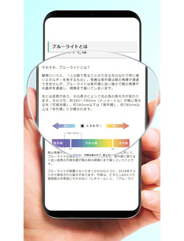 スマホ用レンズももちろんブルーライトカット仕様(JIS規格約27%カット)です。目の負担を軽減します。